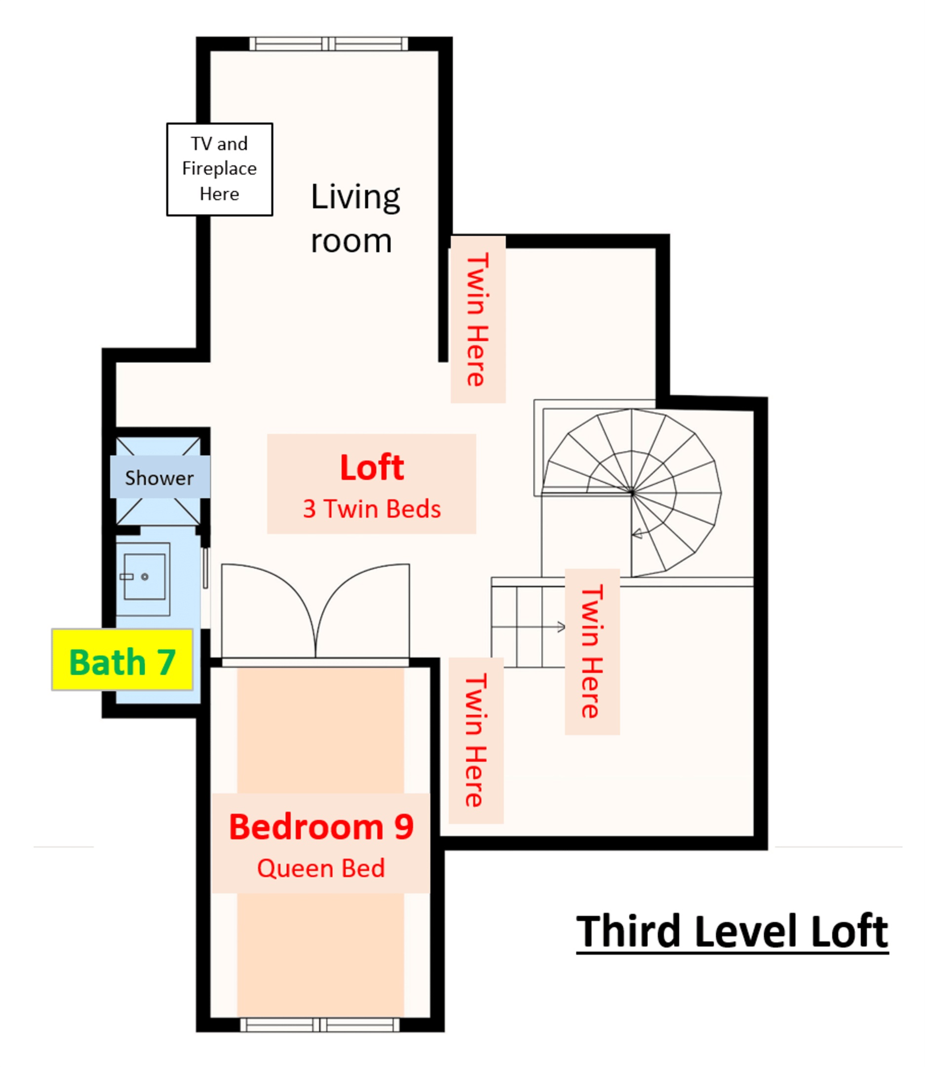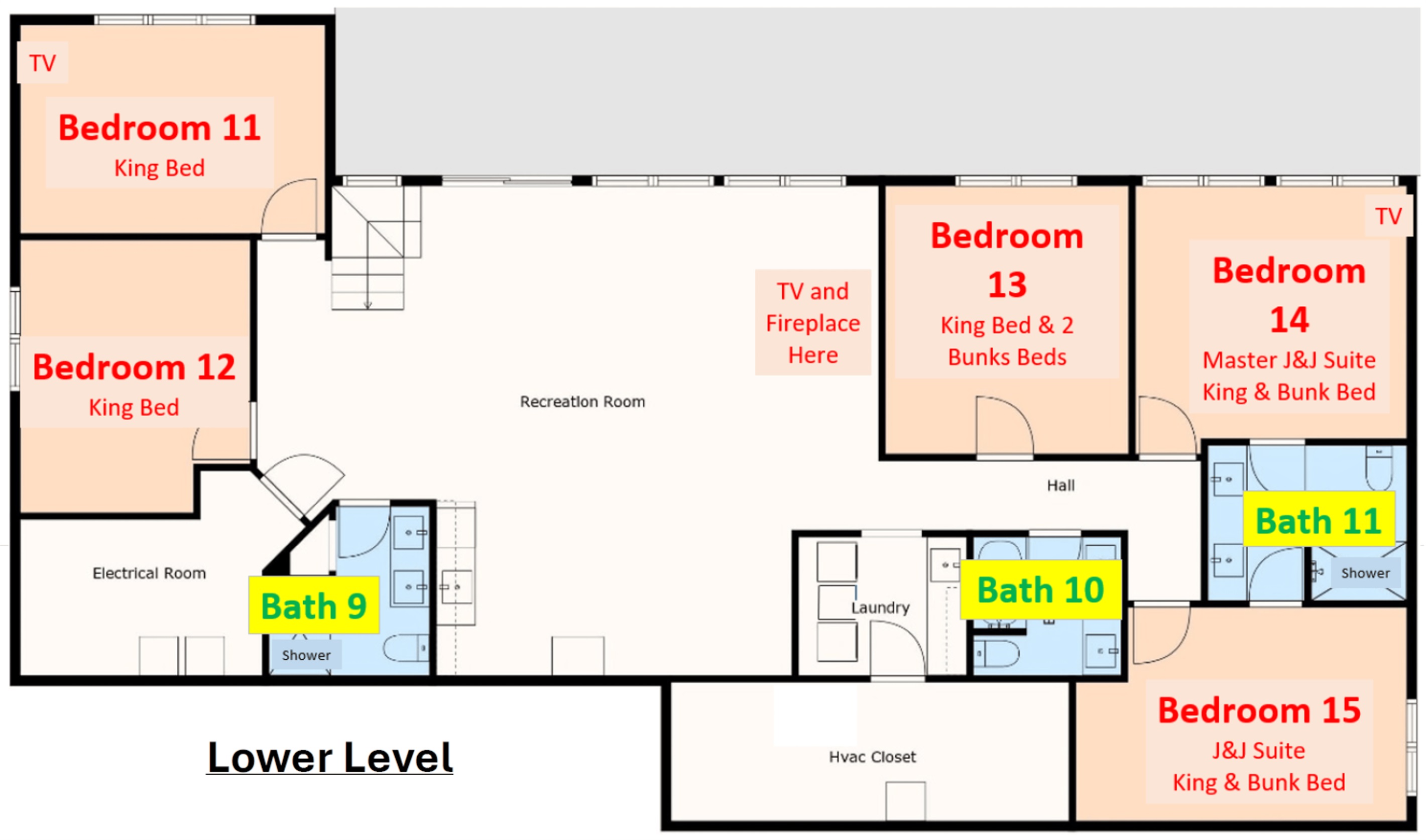 • Downstairs includes a living area (also functions as 16th bedroom) and full bath