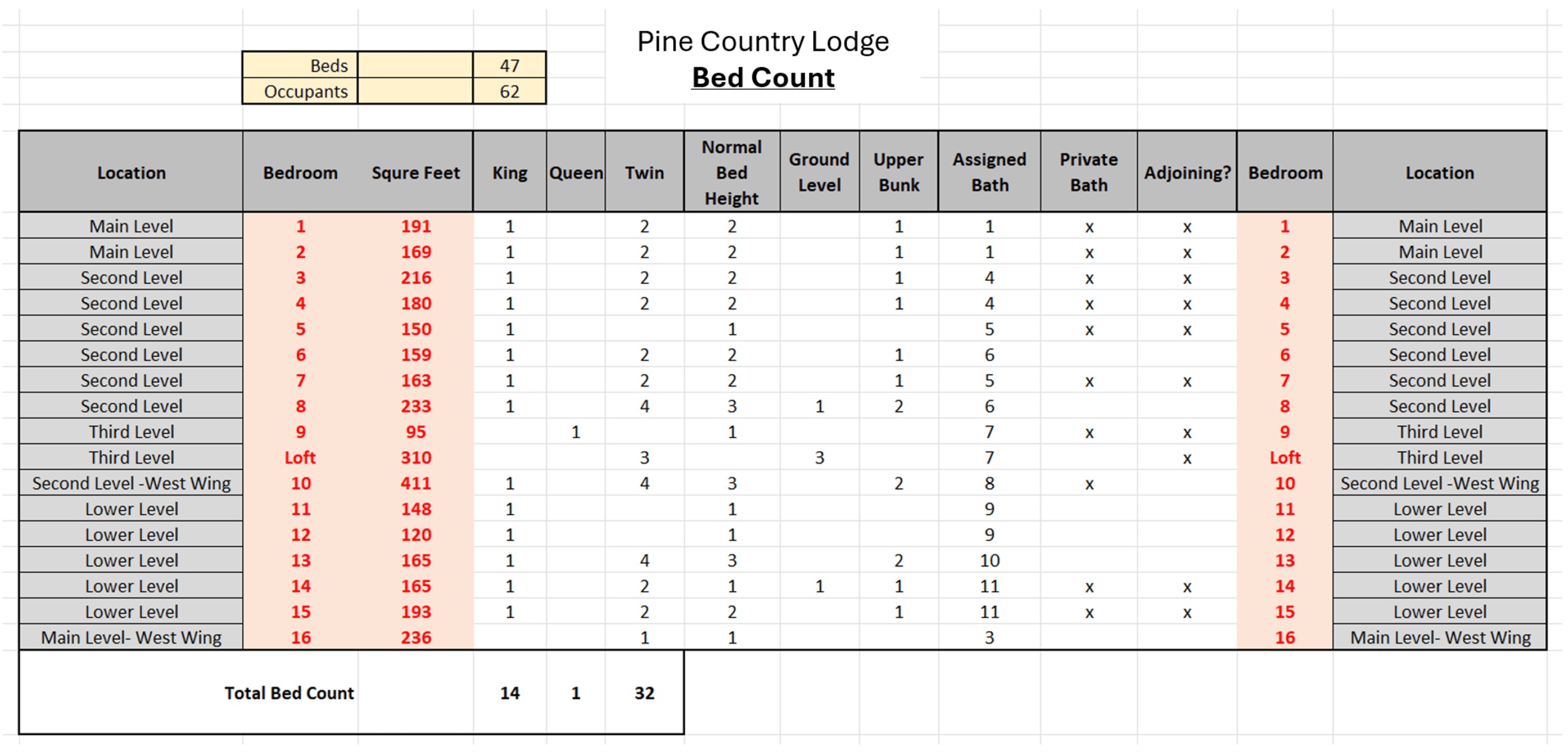 16 Bedrooms: Includes 14 king beds, 1 queen bed, and 34 twin beds. Sleeping Capacity: Can sleep up to 62 people with over 40 beds. Private Suites: 9 bedrooms with adjoining bathrooms, including 1 private master suite and 3 private 2-bedroom suites. Flexible Sleeping Arrangements: Many bedrooms feature additional twin beds (some with up to 4 beds). |